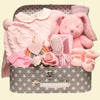 Baby Girl Hamper in a Suitcase. A delightful gift for a newborn baby. It includes beautiful clothing, a plush bunny and baby essentials! Perfect for baby showers or welcoming your little one.